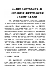 20xx最新个人年终工作总结范文4篇(公务员+公司员工+学校党支部+信访工作)公务员年度个人工作总结一年来,在局领导班子的正确领导下,在同志们的大力支持帮助下,我始终坚持把学习建设具有中国特色社会主义创新理论作为提高自身政治素质的主要途径,认真学习和领会*理论、xxxx重要思想及科学发展观深刻,全面了解掌握了党的xx届X中、X中、X中全会精神及加强党的执政能力建设等方面的重大理论知识,不断提高自身政策理论水平,以增强自身在实际工作中发现问题、分析问题、解决问题的能力。与此同时,我积极参与全县创先争优活动及局上组织的各类学习教育活动,主动分析查找本人在思想认识、工作作风等方面存在的不足和问题,认...
