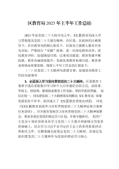 20232023年是党的二十大的开局之年。XX区教育局深入学习贯彻落实党的二十大报告精神,在区委、区政府的正确领导下,在市教育局的精心指导下,以落实立德树人根本任务为目标,严格执行“双减”政策,进一步深化教育改革,优化教育评价,加强规划引领,注重项目跟进,教育资源不断拓展,教育内涵持续提升,各级各类教育协调并进,教育事业持续高质量发展。现将上半年工作总结汇报如下:(一)以党的二十大精神为思想引领,加强党对教育工作的全面领导1.全面深入学习宣传贯彻党的二十大精神。区委教育工委班子成员采取集中学习和个人自学相结合的方式,读原著、学原文、悟原理,紧密联系教育工作实际,坚持学思用贯通、知信行统一,切实...