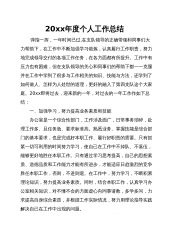 20xx年度个人工作总结 弹指一挥,一年时间已过,在支队领导的正确带领和同事们大力帮助下,在工作中不断加强学习锻炼,认真履行工作职责,努力地完成领导交付的各项工作任务,在各方面都有所提升。工作中有压力也有困难,但在支队领导的关心和同事们的帮助下都一一克服并在工作中学到了很多与工作相关的知识、技能与方法,还学到了如何做人、怎样为人处世的道理,更好的融入了第四支队这个大家庭。20xx即将过去,迎来新的一年,对过去的一年工作作如下总结: 一、加强学习,努力提高业务素质和技能办公室是一个综合性部门,工作涉及面广,日常事务琐碎,处理工作多、且任务急、要求标准高。熟悉业务、掌握技能是综合部门的基本要求,...