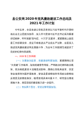 县公安局2020年党风廉政建设工作总结及2021年工作计划今年以来,全县各级公安机关坚持以习近平新时代中国特色社会主义思想为指导,深入学习贯彻习近平总书记系列重要讲话精神,牢牢把握“四句话、十六字”总要求,紧紧围绕上级党委工作部署安排,坚定不移推进从严治党从严治警,全面深入推进党风廉政建设和反腐败斗争,为全年工作圆满完成提供了良好的纪律作风保障。一、2020年工作回顾(一)注重政治监督,党建基础明显加固。紧紧围绕公安“大党建”工作格局,加强党建督导考核,严明政治纪律和政治规矩。坚决彻底肃清X流毒恶劣影响,围绕公安机构改革、扶贫资金使用等问题开展检查,督促县委巡察组和市局政治督察组反馈意见的整改...