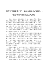某市公安局党委书记、局长作风建设心得研讨:锚定“四个明显”发力正风肃纪目标引领方向,目标凝聚力量。在全省政法系统开展纪律作风专项整治活动,是深入贯彻习近平总书记重要指示精神,纵深推进全面从严管党治警的有力抓手和重要举措。公安机关要充分认清开展专项教育整治的重要性和必要性,坚持目标导向,主动先行一步,牢牢把握“四个明显”的目标要求,自觉以“四个铁一般”的形象定位和“走在前列”的境界担当,深入扎实开展好专项教育整治,为建设“大强美富通”现代化国际大都市筑牢思想根基、涵养力量源泉。要筑牢信仰之基,实现政治意识、宗旨意识明显增强。把牢“公安姓党”根本政治属性,深入学习贯彻习近平新时代中国特色社会主义思...