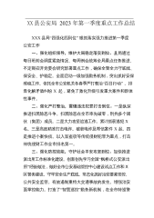 XX县公安局2023年第一季度重点工作总结XXX县局“四强化四到位”狠抓落实强力推进第一季度公安工作一、强化组织领导,维护大局稳定落实到位。县局通过每日班前会调度紧急情况、每周例会统筹全局重点任务推进、不定期召开党委会研究部署重点工作,确保全警全力守底线、保安全、护稳定。全面启动一级加强勤务机制,突出抓好安保维稳工作。依托全市公安机关冬春季严打整治“百日行动”,排查化解矛盾纠纷X起,避免了激化升级引发重大案件和群体性事件。二、强化严打整治,震慑违法犯罪打击到位。一是纵深推进扫黑除恶斗争。扫黑除恶在全市率先破零,刑拘多个团伙(集团)成员。二是大力攻坚追逃工作。累计抓获逃犯X名。三是高效精准打击电...