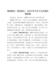纪念中国人民抗日战争暨世界反法西斯战争胜利80周年大会观后感(5篇)(含机关事业单位、国企、学校、银行、街道社区等5篇)一、学校篇此时此刻,我怀着无比崇敬与激动的心情,因为最核心的触动,来自于9月3日在天安门广场隆重举行的中国人民抗日战争暨世界反法西斯战争胜利80周年纪念大会,习近平总书记的重要讲话和盛大阅兵仪式,让我接受了一次深刻的精神洗礼。那震撼人心的一幕幕,宛如历史的钟声在耳畔久久回响,让我对民族独立、人民解放的艰辛求索,有了更深刻地认识;对肩负的时代使命,有了更坚定地自觉。铭记伟大胜利,感恩如山恩情。当雄壮的国歌在天安门广场响彻云霄,当猎猎红旗与受阅部队整齐划一、锐不可当的英姿交相辉映...