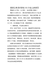 基层公务员代表在XX大会上的发言尊敬的XX书记,XX局长,各位同事,大家好!我是XX分局XXX,我们召开基层公务员XX大会,目的就是要深化对基层XX工作的认识,现在大家齐聚一堂亮思想、亮做法、亮行动,实际上也是一场没有硝烟的较量,同时更是一堂生动的学习课,下面我就X分局,基层XX工作,向大家做以下汇报,请批评指正。一、思想引航,不忘初心抓学习。作为一名共产党员,XX主任,我始终牢记党的宗旨,永葆党员本色,以党的创新理论和业务知识武装头脑,以XX局各项规章制度为工作指南,积极践行XX价值观,狠抓XX分局思想文化建设。领导班子坚持围绕党的政治建设、全面从严治党、理想信念、担当作为、政治纪律、廉洁自...