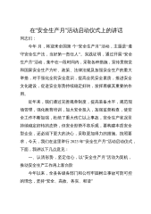 2023年“安全生产月”启动仪式讲话稿今年6月是第22个全国“安全生产月”,按照厅××组及厅安委会的部署要求,我们结合学院实际制定了详实的活动方案,刚才,安委会办公室主任就学院安全生产月活动方案进行了安排,这个方案是学院安委会经过研究周密制定的,我完全赞同,请大家认真遵照执行。下面,我讲几点意见:一、明晰安全生产理念,切实认识安全生产的重大意义安全生产,指的是企事业单位在劳动生产过程中人身安全、设备安全和产品安全以及交通运输安全等。校园安全生产主要包括完善的安全生产规章制度、高素质的安全生产人员队伍、高性能的安全生产防控设备和高效率的安全生产工作机制,通过硬件(设备设施、人员队伍)提质和软件(...