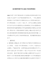 XX集团党委书记2025年度述职报告2025年是"十四五"规划收官之年,是国企改革深化提升行动决胜之年,也是"十五五"规划谋篇布局之年。一年来,集团党委坚持以习近平新时代中国特色社会主义思想为指导,深入学习贯彻党的二十大和二十届三中、四中全会精神,全面落实习近平总书记全国国有企业党的建设工作会议重要讲话精神,特别是"2·26"重要批示和"11·6"重要指示精神,扎实开展深入贯彻中央八项规定精神学习教育,以融合攻坚为抓手,坚持以高质量党建引领保障高质量发展,推动党的领导融入公司治理各环节,各项工作取得积极成效。现将履职情况报告如下:一、履职情况(一)聚焦凝心铸魂,深入学习贯彻习近平新时代中国特色...