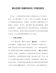 国企党委关于开展“干部素质提升年”活动加强干部队伍建设工作情况的报告今年以来,公司党委坚持以新时代中国特色社会主义思想为指引,全面贯彻落实党的二十大及二十届三中全会精神,自觉践行新时代党的组织路线,全面贯彻“干部素质提升年”工作部署,坚持以“政治铸魂、能力筑基、作风塑形”为主线,着力锻造高素质国企干部队伍,为奋力中国式现代化我市实践提供坚强支撑。一、主要工作情况(一)突出政治铸魂,筑牢思想根基,把稳干部队伍“定盘星”。一是构建理论武装常态化机制。公司创新建立三维一体学习体系,一是完善第一议题制度,将总书记最新重要讲话精神纳入党委会、支委会首要学习内容,建立传达学习-研究部署-督办落实闭环机制。...