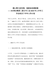 凝心聚力促发展,砥砺奋进谱新篇——XX国企集团二级公司工会2025年上半年工作总结及下半年工作计划“积力之所举,则无不胜也;众智之所为,则无不成也。”2025年上半年,XX国企集团二级公司工会在上级工会和公司党委的坚强领导下,紧紧围绕企业中心工作,以服务职工群众为根本,以维护权益为核心,以促进发展为目标,在思想引领、民主管理、帮扶关怀、文化建设等方面扎实推进各项工作,切实发挥工会组织桥梁纽带作用。现对上半年工作进行全面总结,并结合实际制定下半年工作计划。一、2025年上半年工作总结(一)强化思想引领,筑牢职工信仰根基上半年,工会以学习贯彻党的二十大精神为主线,通过多样化形式推动理论学习走深走实...