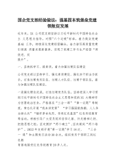 国企加强青年人才建设工作经验做法近年来,**党支部结合公司实际情况,在上级和本级党委的指导下,打造“青年成长谱”党建品牌,以紧扣党管青年人才“中心线”、描绘青年人才选引“基准线”、创新青年人才发展“传输线”、突出青年人才培育"成绩线"、深入青年人才需求“第一线”的“五线谱”党支部工作法,着力解决青年人才队伍建设方面的“一个矛盾两大难题”。以青年成长之谱,奏响人才发展红色交响曲,培育一批坚定不移听党话、跟党走,有理想、敢担当、能吃苦、肯奋斗的新时代好青年。一、紧扣“中心线”,坚定党管青年公司党委始终坚持党对人才工作的全面领导,深刻把握习近平总书记关于人才工作的重要论述精神,强化主体责任,完善党管...