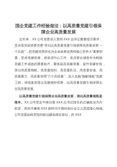 国企党建工作经验做法:以高质量党建引领保障企业高质量发展近年来,XX公司党委深入贯彻XXX总书记重要指示要求,坚决落实国资委党委“突出以高质量党建引领保障高质量发展‘一个主题’”,把党建优势转化为企业发展优势和核心竞争力”重要部署,坚持党建统领,把促进中心工作、党员群众满意作为检验党建工作成效的重要标尺,聚焦提高党建质量、提升党建价值,突出高质量领航、高质量组织、高质量队伍、高质量价值、高质量聚力、高质量管理“六个高质量”,深入实施“旗帜领航”党建工程,持续激发国企党建独特优势,以高质量党建引领保障企业高质量发展。以高质量党建引领保障企业高质量发展,强化高质量领航是根本。XX公司坚定不移沿着X...