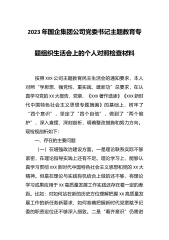 2023年度公司党员干部在理论学习、政治素质、能力本领、担当作为、工作作风、廉洁自律等六个方面专题组织生活会个人对照检查按照党委关于召开主题教育专题民主生活会的有关要求,聚焦"学习贯彻XXX新时代中国特色社会主义思想这一主题,公司党委高度重视、精心组织,确保将此次专题民主生活会开出高质量、开出真实效、开出新活力。下面,我代表公司领导班子,将对照检查情况报告如下:一、主题教育专题民主生活会会前准备情况公司党委在常态化制度化开展好理论学习、研讨交流及主题教育读书班的基础上,xxx月xxxx日,专门组织召开党委理论学习中心组集体学习,重点围绕XXX总书记关于党的建设、国企改革发展、严肃党内政治生活等...