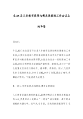 在XX县义务教育优质均衡发展推进工作会议上的讲话同志们:今天,我们在这里召开全县义务教育优质均衡发展推进工作会议,主要任务是深入贯彻落实国家及省市关于推进义务教育优质均衡发展的决策部署,全面总结过去一段时期的工作成效,深刻分析研判当前面临的新形势、新要求,并对下一阶段的重点任务进行再动员、再部署、再落实。刚才,几位同志作了很好的发言,分享了经验,分析了问题,提出了建议,我都表示赞同。下面,我讲几点意见。第一部分:肯定成绩,总结经验,奠定坚实基础义务教育是国民教育的基石,优质均衡是义务教育发展的必然方向,更是回应人民群众“上好学”热切期盼、提升民生福祉的关键之举。近年来,在县委、县政府的坚强领导...