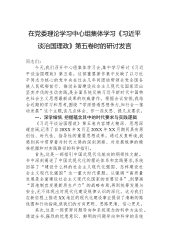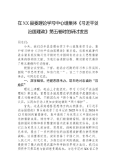 在党委理论学习中心组集体学习《习近平谈治国理政》第五卷时的研讨发言同志们:今天,我们召开中心组集体学习会,集中学习研讨《习近平谈治国理政》第五卷。这部重要著作集中反映了以习近平同志为核心的党中央在过去几年间团结带领全党全国各族人民砥砺前行、推动全面建设社会主义现代化国家迈出坚实步伐的生动实践,是全面系统反映习近平新时代中国特色社会主义思想最新成果的权威著作。根据会议安排,我结合近期的学习和思考,围绕“学深悟透思想伟力,知行合一推动发展”这个主题,谈几点体会、作一些反思、提几点要求。一、深学细悟,把握蕴含其中的时代要求与实践逻辑《习近平谈治国理政》第五卷内容博大精深、思想深邃宏阔,记录了自20X...