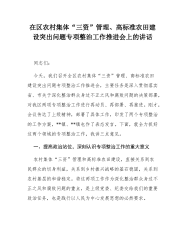 在区农村集体“三资”管理、高标准农田建设突出问题专项整治工作推进会上的讲话同志们:今天,我们召开全区农村集体“三资”管理、高标准农田建设突出问题专项整治工作推进会,主要任务是深入贯彻落实省、市关于深化整治群众身边不正之风和腐败问题的决策部署,对我区两项专项整治工作进行再动员、再部署、再推进。刚才,会议传达了上级精神,部署了具体工作,印发了两个专项整治的工作方案,**镇、**镇也作了表态发言。下面,就全力抓好这两个领域的专项整治工作,我讲三点意见。一、提高政治站位,深刻认识专项整治工作的重大意义农村集体“三资”管理和高标准农田建设,直接关系到农民群众的切身利益,关系到乡村振兴战略的基石稳固,关系...