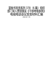 蓝秘书发言系列378(6篇)组织部门深入贯彻落实《干部考核条例》电视电话会议发言材料汇编2020年11月目录1.中共北京市委组织部:聚焦大事要事开展专项考核更好服务首都工作大局12.中共江苏省委组织部:用好政绩考核指挥棒推动高质量发展走在前33.中共福建省委组织部:下沉一线抓常抓长以蹲点调研做实领导干部平时考核54.中共四川省委组织部:突出政治标准坚持从严从实巩固提升省管领导班子和领导干部年度考核75.中共甘肃省委组织部:大力提升干部考核工作质量牢固树立激励担当作为鲜明导向96.中共水利部党组:坚持考“事”与考“人”相结合做好最严格水资源管理制度考核11提升考核质量励担当促发展组织部门深入贯彻...