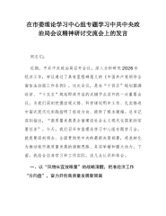 在市委理论学习中心组专题学习中共中央政治局会议精神研讨交流会上的发言同志们:近期,中共中央政治局召开会议,深入分析研究2026年经济工作,审议通过了具有里程碑意义的《中国共产党领导全面依法治国工作条例》。这次会议,是在“十四五”规划圆满收官、“十五五”规划即将开启的关键节点召开的一次重要会议,为我们深刻把握宏观大势、科学谋划明年工作、扎实推进中国式现代化实践指明了前进方向、提供了根本遵循。总书记深刻指出,“高质量发展是全面建设社会主义现代化国家的首要任务”。今天,我们召开市委理论学习中心组专题学习会,就是要深刻领会、全面贯彻党中央的最新决策部署,将其转化为推动我市高质量发展的清晰思路、务实举措...