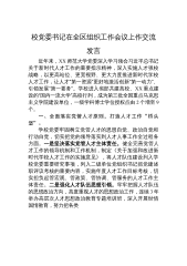 校党委书记在全区组织工作会议上作交流发言近年来,XX师范大学党委深入学习领会习近平总书记关于新时代人才工作的重要指示精神,深入实施人才强校战略,以更高站位、更宽视野、更大力度推进新时代学校人才工作,让人才“第一资源”更好地激活创新“第一动力”、引领发展“第一要务”。学校进入省部共建高校、XX重点建设的“国内一流大学”高校行列,成为第三批全国重点马克思主义学院建设单位,一级学科博士学位授权点由2个增至9个。一、全面落实党管人才原则,打造人才工作“桥头堡”。学校党委牢固树立党管人才的思想自觉、政治自觉和行动自觉,切实把党的领导落实到人才人事工作全过程各方面。一是坚决落实党管人才主体责任。健全完善党...