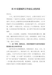 在XX区委城市工作会议上的讲话同志们:今天,我们召开区委城市工作会议,主要任务是深入学习贯彻党的二十届四中全会精神,全面落实习近平总书记在中央城市工作会议上的重要讲话和视察XX重要讲话精神,以及市委城市工作会议的部署要求,总结我区城市工作,分析当前形势,部署下一步重点任务,动员全区上下以更高标准、更实举措,扎实推动城市高质量发展,奋力谱写中国式现代化的XX篇章。刚才,区住建委、区城管委、市规划资源局XX分局、XX街道、XX街道的负责同志作了发言,讲得都很好,体现了对城市工作的深入思考和务实担当。希望大家认真领会,抓好落实。下面,我讲三点意见。一、统一思想,提高站位,深刻把握新时代城市高质量发展...