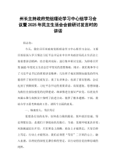 州长主持政府党组理论学习中心组学习会议暨2025年民主生活会会前研讨发言时的讲话同志们:今天,我们召开州政府党组理论学习中心组学习会议,主要目的是深入学习领会习近平总书记在中共中央政治局民主生活会上的重要讲话精神,结合我州实际,进行集中研讨交流,为即将召开的2025年度民主生活会打牢坚实的思想基础。刚才,我们集体学习了习近平总书记的重要讲话精神,几位班子成员围绕加强党的作风建设作了很好的交流发言,谈了认识体会,也谈了落实思路,会议达到了预期效果。习近平总书记的重要讲话,高屋建瓴、思想深邃,为我们全面加强党的纪律建设、纵深推进全面从严治党、以优良作风凝心聚力真抓实干指明了前进方向、提供了根本遵循...