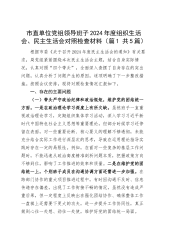 市直单位党组领导班子2024年度组织生活会、民主生活会对照检查材料(篇1共5篇)根据市委《关于召开2024年度民主生活会的通知》有关要求,局党组紧紧围绕本次民主生活会主题,结合自身实际情况,认真对照“四个带头”,全面深入查摆了自身存在的突出问题,认真分析了问题产生的原因,逐项明确了下一步整改措施。按照会议安排,现将对照检查情况汇报如下。一、存在的主要问题(一)带头严守政治纪律和政治规矩,维护党的团结统一方面。一是在政治理论学习深度上有所欠缺。虽然班子一直重视政治理论学习,定期组织集体学习活动,深入学习习近平新时代中国特色社会主义思想等重要理论,但部分时候学习还停留在表面,对一些重要论断、核心要...