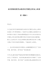 在区委财经委员会经济运行情况分析会上的讲话(精品)同志们:今天,我们召开区委财经委员会经济运行情况分析会,主要任务是深入学习贯彻党的二十届四中全会精神,全面落实中央和市委关于经济工作的决策部署,盘点今年以来全区经济运行情况,分析当前形势,部署冲刺全年目标任务的关键举措。刚才,几位同志作了发言,讲得很好,既实事求是分析了问题,又提出了有针对性的对策建议。下面,我讲三点意见。一、充分肯定成绩,坚定发展信心,准确把握经济运行“总体平稳、稳中有进、进中承压”的发展态势今年以来,面对复杂严峻的宏观环境和艰巨繁重的发展任务,全区上下顶压前行、攻坚克难,推动经济运行保持了“总体平稳、稳中有进、进中承压”的发...
