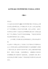 XX学校2025年秋季学期半期工作总结会上的讲话(精品)同志们:今天,我们在这里召开2025年秋季学期半期工作总结会,主要任务是全面回顾总结上半学期各项工作,深入分析当前形势,对下半学期重点工作进行动员部署。刚才,各学部、各部门负责同志分别作了交流发言,讲得都很好,既总结了成绩,也查找了不足,更提出了切实可行的改进措施。下面,我代表学校党支部和领导班子,讲三点意见。一、上半学期工作回顾:深化改革砥砺前行,五育并举成果丰硕过去的半个学期,全校上下坚持以习近平新时代中国特色社会主义思想为指导,全面贯彻党的教育方针,紧紧围绕"立德树人"根本任务,深入推进"五育并举"育人体系,在教育教学质量提升、德育...