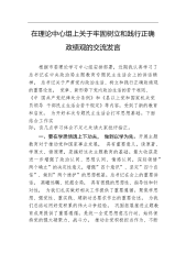 在理论中心组上关于严肃党内政治生活、牢固树立和践行正确政绩观的交流发言 根据市委理论学习中心组安排,我对习近平总书记在中央政治局主题教育专题会议的讲话精神、省委书记X主持召开省委常委会扩大会议精神、市委书记X主持召开的市委常委会会议精神进行了认真学习,重新研读了新形势下党内政治生活的若干准则、《中国共产党纪律处分条例》和《县以上党和国家机关党员领导干部民主生活会若干规定》等党纪党规,结合学习感悟、工作实效与大家交流三点意见。 一、精研细读,深思细悟,在全面学中凝心铸魂 “学之愈深,知之愈明,行之愈笃。”主题教育是一场理论大学习、思想大武装,把学习贯彻习近平新时代中国特色社会主义思想引向深...