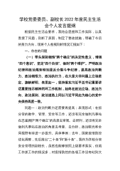 学校党委委员、副校长2022年度民主生活会个人发言提纲根据民主生活会要求,我结合思想和工作实际,认真查摆了问题,剖析了原因,制定了整改措施,明确了今后的努力方向,现将个人检视剖析情况汇报如下:一、存在的问题(一)带头深刻领悟“两个确立”的决定性意义,增强“四个意识”、坚定“四个自信”、做到“两个维护”。严明政治纪律和政治规矩特别是反分裂斗争纪律,提高政治判断力、政治领悟力、政治执行力,在大是大非问题上立场坚定、旗帜鲜明、表里如一,坚持落实习近平总书记重要讲话重要指示精神闭环工作机制,始终在政治立场、政治方向、政治原则、政治道路上同以习近平同志为核心的党中央保持高度一致。问题一:政治判断力还需要...