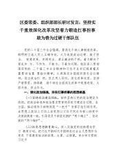 区委常委、组织部部长研讨发言:坚持实千重效深化改革攻坚着力锻造扛事担事敢为善为过硬干部队伍党的二十届三中全会强调,要深化干部人事制度改革,鲜明树立选人用人正确导向,大力选拔政治过硬、敢于担当、锐意改革、实绩突出、清正廉洁的干部,着力解决干部乱作为、不作为、不敢为、不善为问题。我区深入贯彻落实党的二十届三中全会精神和习近平总书记视察重庆重要讲话重要指示精神,认真落实全国组织部长会议精神,突出政治引领,匡正用人导向,深化改革攻坚,坚持严管厚爱,持续激励干部在全面深化改革中锐意进取、大胆开拓、担当作为。一、强化政治铸魂,夯实扛事担事的思想根基(一)坚持政治建设领航。始终坚持以党的政治建设为统领,把政...