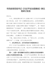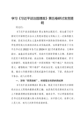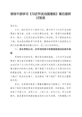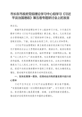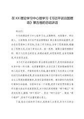 在XX理论学习中心组学习《习近平谈治国理政》第五卷的总结讲话同志们:今天的理论学习中心组学习会,主题鲜明、内容集中、研讨深入。大家围绕《习近平谈治国理政》第五卷这部权威著作,结合各自思想和工作实际,交流了学习体会,分享了思想感悟,碰撞出了思想火花,达到了深化认识、统一思想、凝聚力量的预期目的。刚才几位同志的发言,有理论高度,有思想深度,也有实践维度,听后很受启发。《习近平谈治国理政》第五卷的出版发行,是党和国家政治生活中的一件大事。这部重要著作,生动记录了党的领袖领导党和人民应变局、开新局的伟大实践,集中展现了马克思主义中国化时代化的最新成果,是全面系统反映习近平新时代中国特色社会主义思想的最...