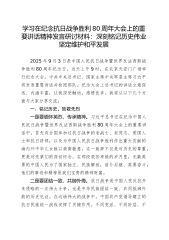学习在纪念抗日战争胜利80周年大会上的重要讲话精神发言研讨材料:深刻铭记历史伟业坚定维护和平发展2025年9月3日是中国人民抗日战争暨世界反法西斯战争胜利80周年纪念日。当天上午9时,在北京天安门广场举行纪念大会。中共中央总书记、国家主席中央军委主席习近平将发表重要讲话并检阅部队。纪念大会上总书记的讲话立意深远、内涵丰富,让我深受触动,感悟良多。我将从以下几个方面与大家分享交流:一、铭记历史,致敬先烈一是要缅怀英烈,传承精神。习近平总书记在纪念中国人民抗日战争暨世界反法西斯战争胜利80周年大会上的重要讲话中,首先向全国参加过抗日战争的老战士、老同志、爱国人士和抗日将领,以及为中国人民抗日战争胜...