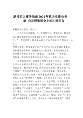 退役军人事务局在2024年机关党建业务融合发展推进会上的汇报发言尊敬的各位领导,同志们:习近平总书记强调,“只有围绕中心、建设队伍、服务群众,推动党建和业务深度融合,机关党建工作才能找准定位。”市退役军人事务局始终以习近平新时代中国特色社会主义思想为指导,贯彻落实习近平总书记关于机关党建的重要讲话和重要指示精神,坚持围绕中心抓党建、抓好党建促业务,将党建工作和业务工作一起谋划、一起部署、一起落实、一起检查,促进机关党建与业务工作合心、合拍、合力。坚持统筹协调,促进机关党建与业务工作合心。党建和业务对机关建设发展来说,是“一体两面”的关系,脱离党建谈业务,就会迷失方向;脱离业务谈党建,就会变成“...