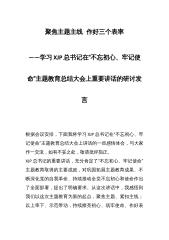 聚焦主题主线作好三个表率——学习XJP总书记在“不忘初心、牢记使命”主题教育总结大会上重要讲话的研讨发言根据会议安排,下面我将学习XJP总书记在“不忘初心、牢记使命”主题教育总结大会上讲话的一些感悟体会,与大家作一交流,如有不妥之处,敬请批评指正。XJP总书记的重要讲话,充分肯定了“不忘初心、牢记使命”主题教育取得的主要成效,对巩固拓展主题教育成果、不断深化党的自我革命、持续推动全党不忘初心和使命作出了全面部署,提出了明确要求。从这次讲话中,我感悟到我们以这次主题教育为新的起点,聚焦主题、紧扣主线;以上率下、示范带动,持续擦亮初心、筑牢使命、作好表率。一是听从指挥、维护核心,在对党忠诚上作好表...
