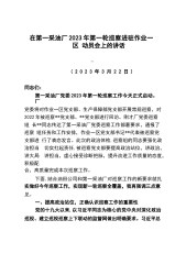 在第一采油厂2023年第一轮巡察进驻作业一区动员会上的讲话***(2023年3月22日)同志们:第一采油厂党委2023年第一轮巡察工作今天正式启动。厂党委将对作业一区党支部、生产保障部党支部开展常规巡察,对2022年被巡察**党支部、**党支部进行回访。刚才厂党委巡察组长**同志传达了第一采油厂党委巡察工作部署要求,通报了巡察组任务和工作安排,作业一区党支部书记**代表被巡察党支部进行了表态发言。此次的政治体检,巡察组的同志要强化政治担当切实扛起责任,被巡察党支部要提高政治站位,讲政治,讲大局讲担当,虚心接受诊断把脉,提升改进工作质量的态度,积极配合,高质量完成本次巡察工作。下面,结合油田公司...