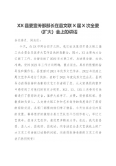 XX县委宣传部部长在县文联X届X次全委(扩大)会上的讲话各位委员、同志们:今天,在XX市两会召开之际,我们在这里召开县文联三届三次全委会及优秀文艺作品扶持表彰会。刚才,XX主席向大会汇报了工作,全面总结了2022年文联工作,总结得全面、生动、准确,安排2023年工作方向明确,重点突出,具有的很强的指导性和操作性。县里面对2021年优秀文艺作品、2022年抗疫主题文艺作品进行了扶持,表彰了2021年度优秀文艺会员,县领导为获得扶持和表彰的文艺工作者颁了奖,从大家热烈的掌声中感受到了对他们的肯定与祝贺。XXX、XX、XXX三名委员代表都进行了很好的发言,值得大家学习、点赞。县委组织部、县教委的负责...