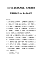 2023在全县民政系统党建、党风廉政建设暨意识形态工作专题会上的讲话同志们:今天我们召开民政系统党建、党风廉政建设暨意识形态工作专题会,主要任务是:认真落实中央、省委、市委和县委关于党建、党风廉政建设及意识形态工作的相关部署,安排部署今年工作任务,动员全体干部职工进一步压实责任、聚焦重点、担当作为、狠抓落实,不断提高工作效能为推动××民政事业高质量发展提供坚强纪律保障。前面,大家一起观看了警示教育片,××同志传达学习了县纪委第十四届二次全会精神并安排党建、党风廉政建设工作,××同志组织学习了意识形态相关规定并安排意识形态工作,县婚姻登记处、殡葬管理所、儿童福利院做了表态发言,我完全赞同。尤其是...
