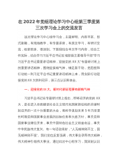 在2022年党组理论学习中心组第三季度第三次学习会上的交流发言这次理论学习中心组学习会,主题鲜明、内容丰富、形式新颖,有现场教学,有专题讲座,有原文学习,有研讨交流,收获很多、很深刻。下面我结合本次学习内容,结合工作实际,结合学习习近平总书记在省部级主要领导干部“学习习近平总书记重要讲话精神,迎接党的XX大”专题研讨班上的重要讲话精神,围绕提振精气神,铆足新干劲,把思想和行动统一到习近平总书记重要讲话精神上来,用实际行动迎接党的XX大胜利召开,谈三点认识和体会。一、迎接党的XX大,新时代新征程要有新精气神习近平总书记在专题研讨班上指出,即将召开的党的XX大,是在进入全面建设社会主义现代化国家新...