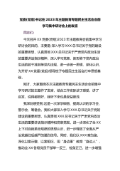 党委(党组)书记在2023年主题教育专题民主生活会会前学习集中研讨会上的发言同志们:今天召开XX党委(党组)2023年主题教育会前集中学习研讨会的目的,主要是:深入学习XXX总书记关于党的建设的重要思想,认真贯彻XXX总书记关于严肃党内政治生活的重要讲话指示精神,深入学习党章、新形势下党内政治生活的若干准则等党内法规,进一步统一思想、深化认识,为开好XX党委(党组)领导班子专题民主生活会打牢思想基础。刚才,大家围绕本次主题教育专题民主生活会会前集中学习研讨的主题作了发言,结合工作实际谈了感受、讲了启发,说得都很好,我听下来也是受益匪浅。我深刻感受到:这是一次深学细悟、提高认识的学习会、警示会、...
