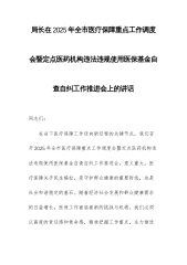 局长在2025年全市医疗保障重点工作调度会暨定点医药机构违法违规使用医保基金自查自纠工作推进会上的讲话同志们:在当下医疗保障工作迈向新征程的关键节点,我们召开2025年全市医疗保障重点工作调度会暨定点医药机构违法违规使用医保基金自查自纠工作推进会,意义重大。医疗保障关乎民生福祉,是守护群众健康的重要防线,也是社会和谐稳定的基石。随着经济社会发展和群众健康需求的日益增长,医保工作面临着新的挑战与机遇。我们必须以高度的责任感和使命感,精准把握工作重点,全力推进各项任务落实,为全市人民提供更加优质、高效、公平的医疗保障服务。一、深化思想认知,筑牢医保工作根基(一)明晰医保战略定位,顺应时代发展需求。...
