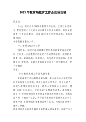 2023年教育局教育工作会议讲话稿同志们:今天,我们召开2023年教育工作会议,主要任务是学习贯彻党的二十大和自治区教育工作会议精神,落实全盟教育工作会议要求,总结2022年工作所得成绩,谋划部署2023年全县教育重点工作。一、回顾2022年工作2022年,面对严峻的疫情防控形势和教育发展稳定的艰巨任务,全县教育系统坚定不移地贯彻县委、政府的工作要求,直面挑战、迎难而上,在危局中攻坚破难,在困境中逆势而进,在重大考验面前交出了一份可圈可点、好于预期的答卷。(一)教育党建工作呈现新气象党对教育工作的领导全面加强。有力推进中小学校党组织领导的校长负责制,实现全县中小学书记、校长全部“一肩挑",新增...