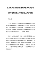 在卫健系统巩固拓展健康扶贫成果同乡村振兴有效衔接工作推进会上的讲话稿 同志们: 今天,我们召开全县卫健系统巩固拓展健康扶贫成果同乡村振兴有效衔接工作推进会召开这次会议,主要任务是认真学习中省市县关于脱贫攻坚、乡村振兴相关文件及会议精神,对全系统2023年巩固拓展健康扶贫成果同乡村振兴有效衔接工作进行再动员、再部署、再落实。 刚才,xxx同志传达了《中共中央国务院关于做好2023年全面推进乡村振兴重点工作的意见》文件精神;xxx同志对防返贫同台监测系统进行了专题培训。讲的都很好,直击我们工作的难点堵点问题,很有针对性和指导性,会后请大家对照中省文件精神、培训要点,查漏补缺,固本强基,大力提...