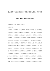 职业教育中心主任在2024年秋季开学典礼讲话:大力弘扬教育家精神做奋发有为的勉职人尊敬的各位老师,亲爱的同学们:大家下午好!金秋九月,硕果盈枝。值此喜庆第40个教师节之际,我们全体师生齐聚在这里隆重举行2024年秋季开学典礼,首先,我代表学校党政领导班子向全体教职员工致以诚挚的节日问候,祝你们工作顺利、家庭幸福、节日快乐!对新入职的教师和24级新同学的到来表示热烈欢迎,欢迎你们加入“X县职业教育中心”这个温暖的大家庭。刚才,X主任宣读了上学期优秀教师、优秀班主任、先进处室、教研组的表彰决定,X主任通报了各类优秀学生和先进班集体,师生代表们作了精彩发言。在此,我代表学校向获得表彰的部门、老师们、...