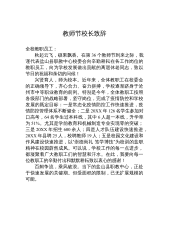 办满意教育建教育强市在阆中市庆祝第37个教师节暨表扬大会上的讲话阆中市委宣传部部长王小冬(2021年9月10日)尊敬的各位老师、同志们,以及今天参与见证庆祝活动的可爱的孩子们:大家上午好!教师节是平凡的节日,却有着辉煌的内涵;教师节是普通的日子,却有着五彩缤纷的色彩!因为我们是人类灵魂的工程师,将“9月10日”这个平淡的日子变得伟大而神圣。在第37个教师节来临之际,我们在此隆重集会,表扬优秀教师、聆听最美声音、感受动人事迹,共同庆祝人民教师的节日。首先,我谨代表市委、市政府,向全市广大教师和教育工作者致以节日的问候!向受到表扬的先进集体和先进个人表示热烈的祝贺!向长期以来关心支持阆中教育事业发...