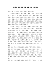 领导在庆祝教师节暨表彰大会上的讲话各位老师、同志们:九月丹桂香,教师迎佳节春风化雨育桃李,硕果累累正飘香。今天,我们满怀喜悦,欢聚一堂,热烈庆祝第39个教师节,隆重表彰一批在教育发展工作中涌现出来的先进集体和先进个人,营造尊重知识、尊重人才、尊重教育的浓厚氛围。在此,我谨代表镇党委、政府向在座的各位,并通过你们向全体教育工作者、离退休教师致以节日的问候和崇高的敬意!向受到表彰的先进集体和先进个人表示热烈的祝贺!一年来,在区委、区政府和上级教育行政部门的正确领导下,在社会各界爱心人士的大力关心支持下,在全镇教职员工的共同努力下,我们坚持立德树人,聚焦教育教学质量,促进教育公平,深化教育体制改革,...