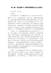 第一篇:在庆祝第39个教师节暨表彰大会上的讲话各位老师、同志们:大家好!在这秋高气爽、丹桂飘香的九月,我们迎来了第39个教师节。今天,我们满怀喜悦、欢聚一堂,隆重表彰优秀教师,共同展望项里街道教育事业发展的美好前景。我代表项里街道党工委、办事处,向今天受到表彰的单位和个人表示热烈的祝贺!向辛勤工作在教育战线上的全体教职员工和离退休的老同志、老教师致以节日的慰问!并通过你们向默默支持你们工作的家人表示衷心的感谢和亲切的问候!也向长期支持、关心项里教育事业发展的各界人士表示崇高的敬意!过去的一年,项里的教育事业在各位的共同努力下,小学、幼儿园都出了许多可喜的成果,值得褒奖。学校的校容校貌、硬件设施...