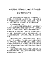 XX省贯彻落实国务院扎实稳住经济一揽子政策措施实施方案为认真贯彻落实党中央“疫情要防住、经济要稳住、发展要安全”的要求和国家33条稳经济措施,在落实好我省“5+4”稳进提质政策体系的基础上,按照全面顶格、能出尽出、精准高效的原则,结合我省实际,制定本实施方案。一、财政支持措施(7项)1.进一步加大增值税留抵退税政策力度。加快退税进度,确保现有可退增量及存量留抵税额退税2022年5月底前大头落地、6月底前基本完成。落实新扩围的批发和零售业,农林牧渔业,住宿和餐饮业,居民服务、修理和其他服务业,教育,卫生和社会工作,文化、体育和娱乐业等7个行业企业留抵退税政策,加大退税资金调度力度,实现应退尽退。...