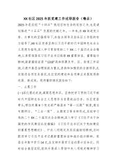 XX社区党委书记2025年度抓基层党建工作述职报告(精品)在XX街道党工委、办事处的坚强领导下,XX社区党委深入学习贯彻习近平新时代中国特色社会主义思想和党的二十届三中全会精神,巩固拓展主题教育成果,深入开展党纪学习教育,弘扬社区家风文化,打造客家文化的传承社区,获评XX省家庭文明建设示范点,XX省民主法治示范社区,XX市儿童友好社区。现将工作报告如下:一、主要工作(一)突出党建主业意识,加强党员思想建设。深化主题教育,组织开展“学习贯彻习近平新时代中国特色社会主义思想主题教育和党史学习教育,共开展了16次书记讲主题教育相关党课,提高了党员的政治理论水平和党性修养。抓实党纪学习教育,组织全体党...