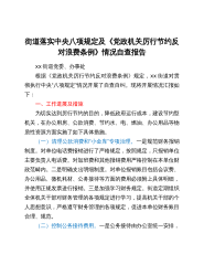 街道落实中央八项规定及《党政机关厉行节约反对浪费条例》情况自查报告xx街道党委、办事处根据《党政机关厉行节约反对浪费条例》规定,xx街道对贯彻执行中央“八项规定”情况开展了自查自纠。现将开展情况汇报如下:一、工作进展及措施为切实达到厉行节约的目的,降低政府运行成本,建设节约型机关,在办公用房、公款消费、节约水、电、燃油、办公用品等物质性资源方面实施了如下具体措施。(一)清理公款消费和“小金库”专项治理。一是规范财务报销制度。对单位电话费报销进行了严格规定,按照规定,只报销单位主要负责人电话费。对加班费和其他报销费用严格控制在本单位财政范畴内。二是明确支出明细制度。对单位报销账目包括会议费、办公...