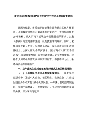 XX市直领导在2022年度“六个对照”民主生活会对照检查材料按照市纪委、市委组织部部署安排和我办工作方案要求,会前我按照学习计划认真学习党的XX大报告和相关文件资料,深入学习习近平总书记重要指示要求,以及《条例》等党内法律法规,认真参加学习研讨。同时,紧扣会议主题,在充分征求意见建议、深入开展谈心谈话的基础上,认真对照“六个带头”要求,突出“两个对照”“三个摆进去”,深刻查摆检视,深挖问题根源,定实整改措施。现将个人对照检查情况向组织汇报如下。不妥不详之处,敬请各位领导批评指正。一、上年度民主生活会整改落实情况及有关情况报告(一)上年度民主生活会整改落实情况。上年度民主生活会中,通过个人自查、...