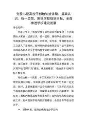 党委书记高校干部培训班讲稿:提高认识、统一思想,围绕学校规划目标,全面推进学校建设发展各位老师:大家上午好!根据学校干部培训班方案要求,今天由我给大家做《提高认识、统一思想,围绕学校规划目标,全面推进学校建设发展》的讲座。近年来,中国特色社会主义进入了新时代,新时代的职业教育是在习近平新时代中国特色社会主义思想指导下的职业教育,是实现高质量发展的职业教育,是服务国家战略、重视百姓民生关切的职业教育,作为高职院校,这就要求我们进一步抢抓机遇、加压奋进、开拓进取,推动职业教育高质量发展,为实现学校“双高计划”建设、优质校建设、“强校升本”战略目标不懈努力。站在这样一个高度,今天我将从三个大方面就“...